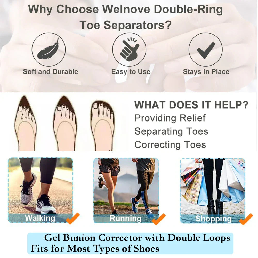 Découvrez la solution parfaite pour soulager vos pieds et retrouver le confort indispensable au quotidien ! Ces séparateurs d'orteils conçus spécialement pour le Hallux Valgus vous offrent une correction efficace et un soulagement durable.