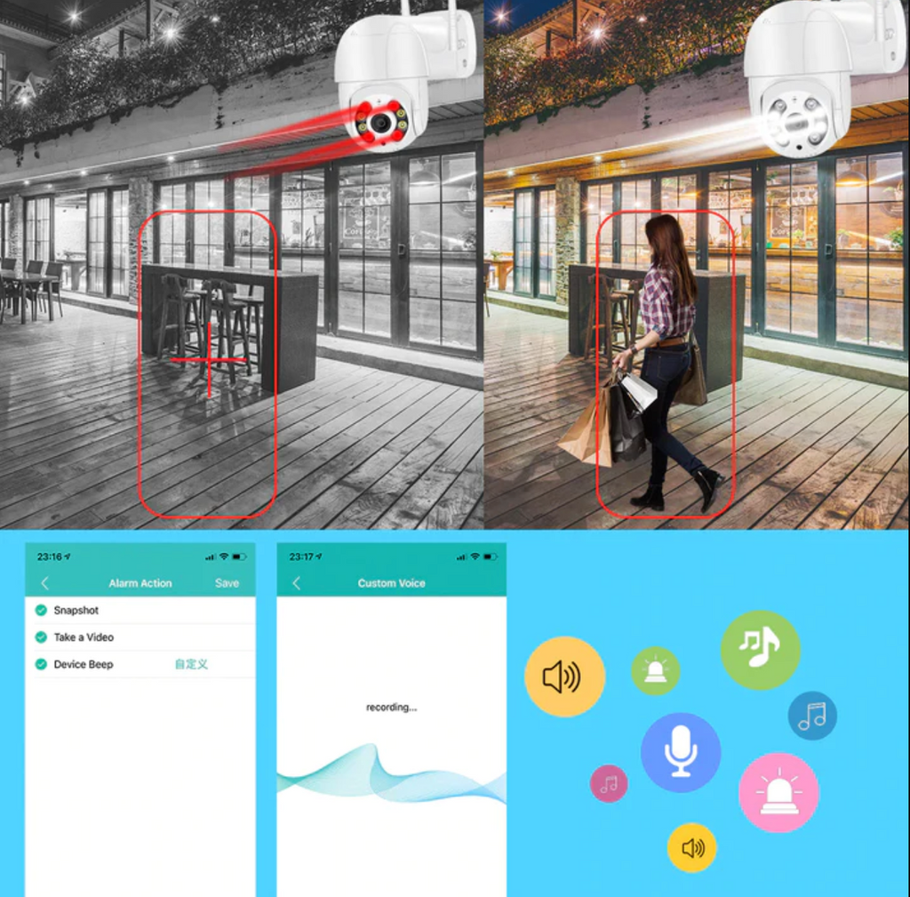Cette caméra extérieure adopte un objectif HD de 5 mégapixels et des capteurs CMOS Sony 335, vous offrant des images plus claires, près de 2,4 fois meilleures que 1080p. La caméra ip est dotée d'une LED infrarouge et blanche matricielle, vous offrant une vision nocturne en couleur, et le mode IR-CUT peut être commuté automatiquement sur la vision nocturne. (atteignez jusqu'à 60 m même dans un environnement extrêmement sombre)