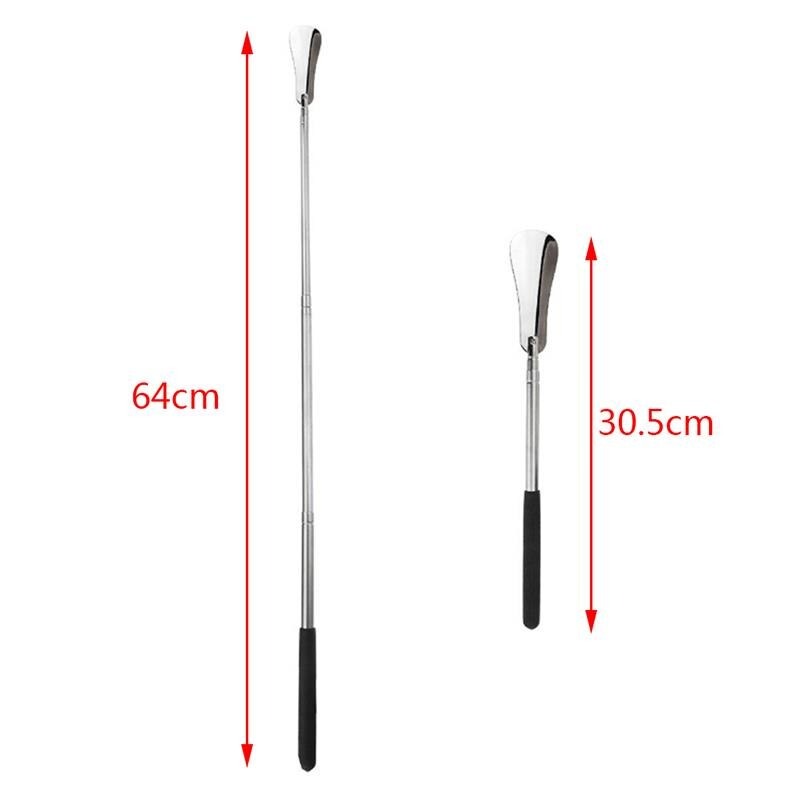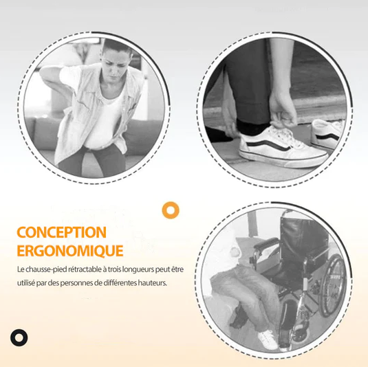Notre chausse-pied permet aux personnes ayant des douleurs articulaires, maux de dos, problème de souplesse ou problème pour enfiler leurs chaussures de le faire sans se baisser et sans efforts. Comment ? Grâce à son bras télescopique réglable sur trois longueurs pouvant aller de 31 cm jusqu'à 65 cm !