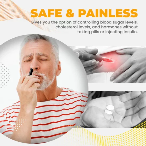Évitez les aiguilles et les piqûres fréquentes avec notre inhalateur nasal innovant ! Comment cela est possible ? L'inhalateur nasal est un moyen simple et efficace d'introduire le médicament dans votre système lorsqu'il en a besoin. Ça marche en délivrant de petites quantités d'ingrédients favorisant la glycémie et de matières organiques essentielles directement dans la circulation sanguine à travers les muqueuses de votre nez, ce qui signifie qu'il n'y a pas d'aiguilles impliquées (ou toute autre procédure invasive).