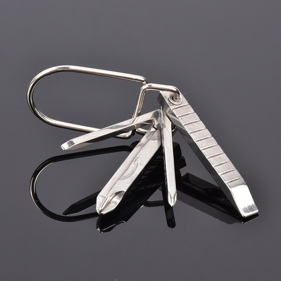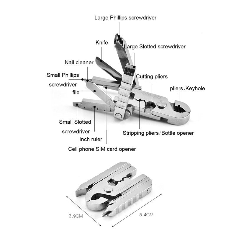 Avec ce nouvel outil multifonctions, vous aurez dans vos mains 10 outils en un seul objet. Des outils comme : une pince étroite, une pince standard, un coupe-fil fin, des ciseaux, une scie à bois, un tournevis plat, un couteau, un ouvre-bouteille et un tournevis à bois, qui vous aideront à vous sortir d'un mauvais pas.
