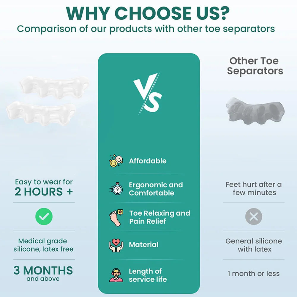Offrez à vos pieds le confort qu'ils méritent avec notre séparateur pour alignement d'orteils en silicone médical. Dites adieu aux douleurs et profitez d'une marche légère et agréable au quotidien.